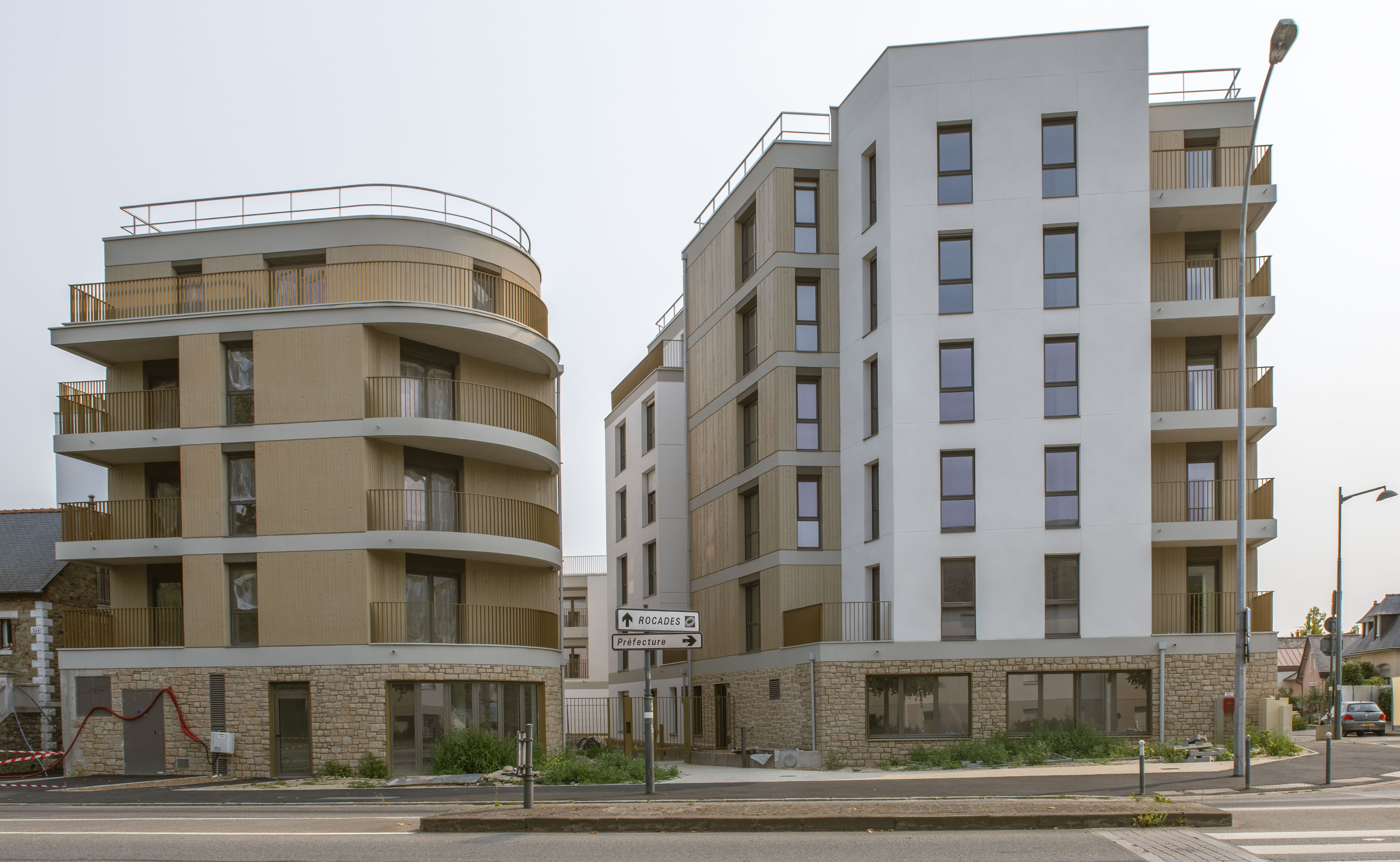 Réalisé par l’architecte François Colcombet de chez Tadamm Architecture, le programme comprend 3 bâtiments allant du R+2 au R+5 permettant au bâtiment de s'intégrer parfaitement avec les constructions aux alentours. Les façades ont un rez-de-chaussée en parement de pierre naturelle claire et les étages sont enduits de peinture blanche ou sable.